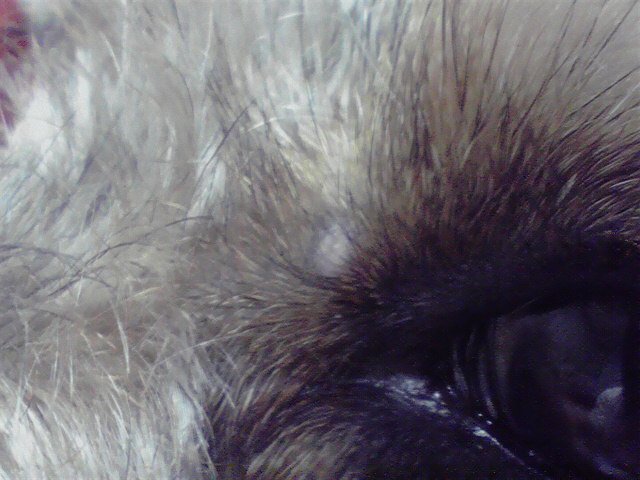 画像中央の白いポッチがダニによる脱毛。
